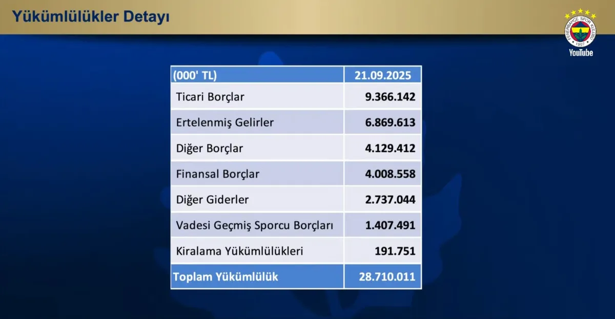 18 Ekim tarihinde Fenerbahçe’nin 31 Ağustos 2025 tarihi itibarıyla toplam borcu 395 milyon euro (19 milyar 252 milyon TL) olarak açıklanmıştı.