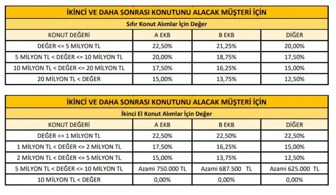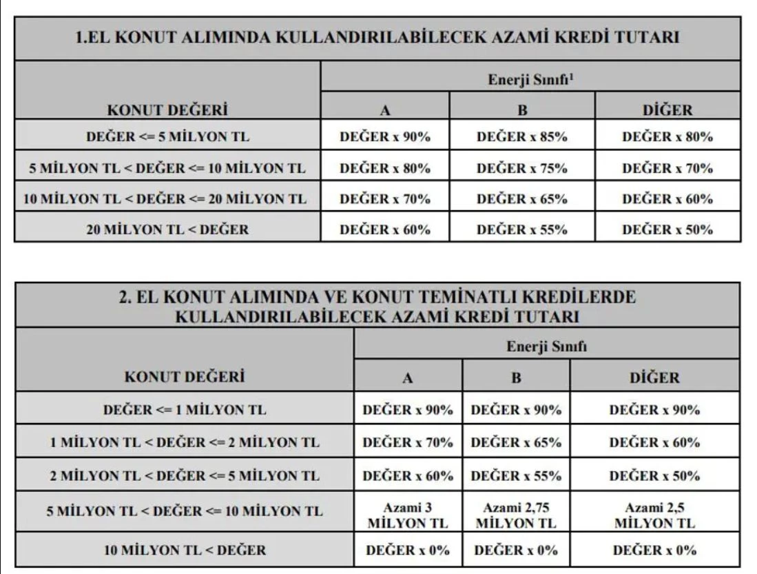 Bu oran, aynı değer diğer konutlarda ise yüzde 70 olarak uygulanacak. 5 milyon TL ile 7 milyon TL arasındaki konutlarda ise bu oranlar A ve B enerji sınıfında konut değerinin yüzde 80'ine, C sınıfı için yüzde 70'ine, diğer konutlarda ise yüzde 60'ına kadar kredi kullanılabilecek.