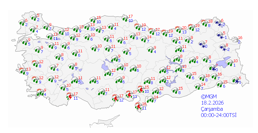Ülke genelinde etkili olması beklenen yağışlı hava etkisini göstermeye başladı. Meteoroloji Genel Müdürlüğü (MGM), 18 Şubat 2026 Çarşamba günü 6 ilde karla karışık yağmur, 75 ilde ise sağanak yağış beklediğini duyurdu.