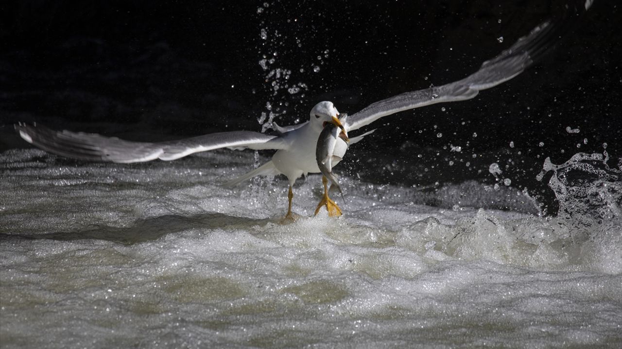 Van Gölü'nden tatlı sulara akın eden inci kefallerinin göçü izleyenleri mest ederken göç yolundaki balıkların martılarla mücadelesi göresel şölen sunmaya devam ediyor.