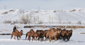 Gün boyunca karlı tepe ve yaylalarda develerin tüylerini tarayarak bakımlarını yapan Arslan'ın hayvanlarla kurduğu bağ görenleri şaşırtıyor.