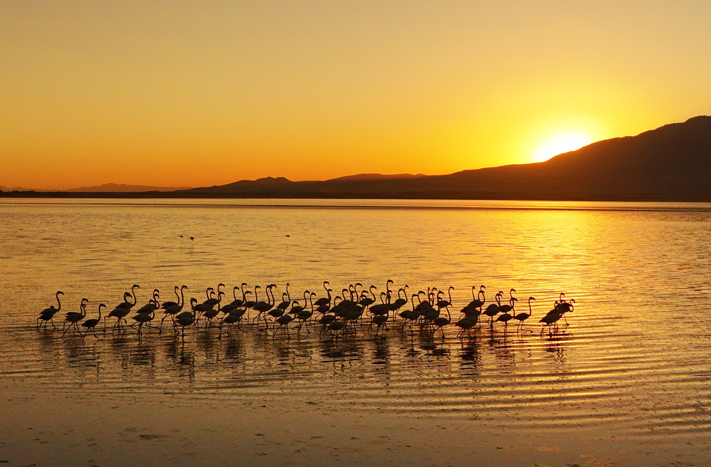 Van Gölü’nün sığ alanlarını beslenme ve dinlenme noktası olarak tercih eden flamingolar, akşam saatlerinde güneşin batışıyla birlikte görsel bir şölen sundu. Özellikle gökyüzünün kızıl tonlarıyla birleşen manzara, Süphan Dağı’nın silueti eşliğinde adeta kartpostallık görüntüler oluşturdu.