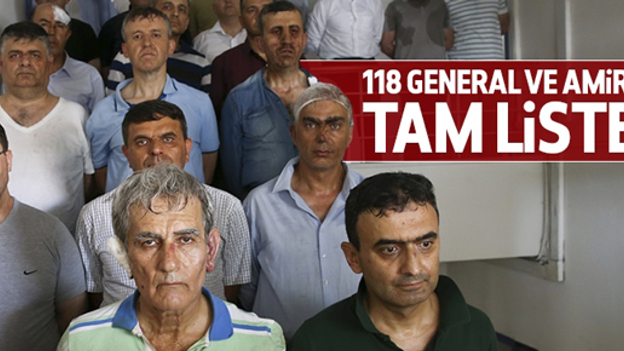 Yakalanan general ve amirallerden 118'inin ismi şöyle: