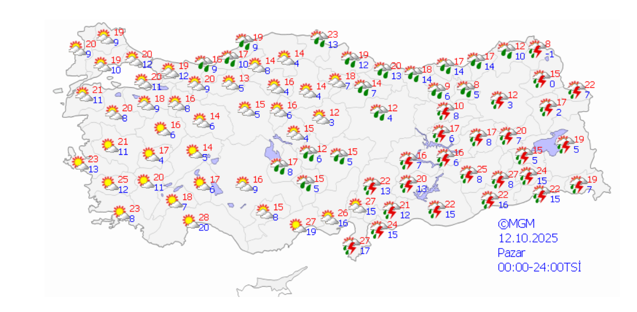 Pazar günü yağışların Karadeniz'in tamamında, Doğu Anadolu Bölgesi'nin doğusunda ve Güneydoğu Anadolu Bölgesi'nde aralıklarla devam edeceğini söyleyen Macit, yağışlı sistemin yurdu terk edeceğini bildirdi.