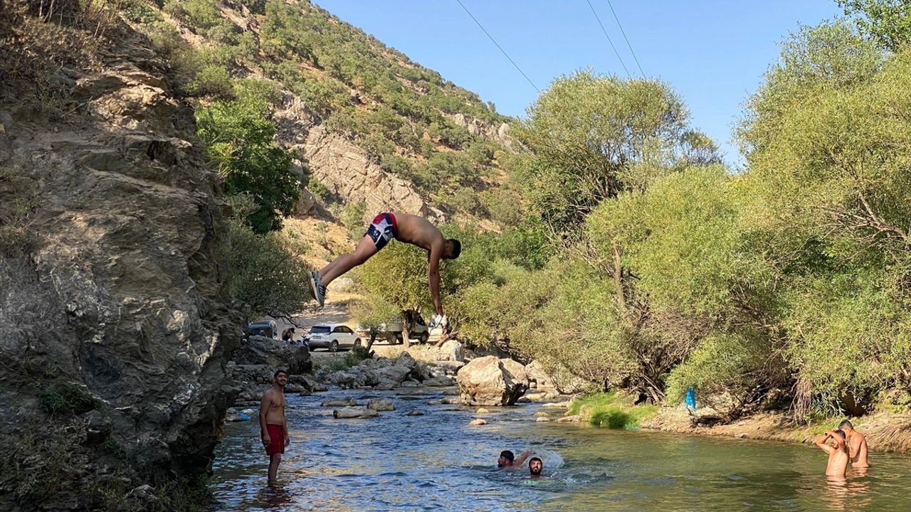 Termometrelerin 35 dereceyi gösterdiği bölgede gençler ve çocuklar, serinlemek için derede serinliyor.
