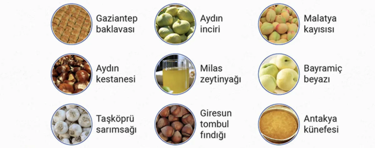 Türkiye'nin AB'den coğrafi işaret tescili alan ürünleri şunlar: Gaziantep baklavası, Aydın inciri, Malatya kayısısı, Aydın kestanesi, Milas zeytinyağı, Bayramiç beyazı, Taşköprü sarımsağı, Giresun tombul fındığı, Antakya künefesi, Suruç narı, Çağlayancerit cevizi, Gemlik zeytini, Edremit zeytinyağı, Milas yağlı zeytini, Ayaş domatesi, Maraş tarhanası, Edremit Körfezi yeşil çizik zeytini, Ezine peyniri, Safranbolu safranı, Aydın memecik zeytinyağı, Araban sarımsağı, Osmaniye yer fıstığı, Bingöl balı, Bursa şeftalisi, Hüyük çileği, Bursa siyah inciri, Söke pamuğu, Manisa mesir macunu, Gaziantep menengiç kahvesi, Silifke yoğurdu, Aydın memecik zeytini, Erzincan tulum peyniri, Aydın çam fıstığı, Afyon pastırması, Afyon sucuğu, Gaziantep fıstık ezmesi, Mut zeytinyağı, Kırkağaç kavunu.