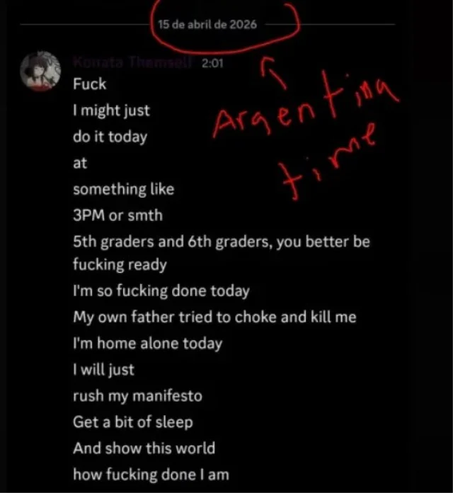 İddialara göre, saldırganın Discord adlı mesajlaşma uygulamasında yer alan yazışmalarında okulu silahla basacağını ve bir katliam gerçekleştireceğini ifade ettiği belirlendi. Mesajlarında saldırının saatine kadar detay verdiği öne sürüldü. Yazışmalarda “Bunu bugün yapabilirim”, “Öğleden sonra 3 ya da o sıralarda” ve “Bu dünyaya ne kadar tükendiğimi göstereceğim” gibi ifadelerin yer aldığı görüldü.