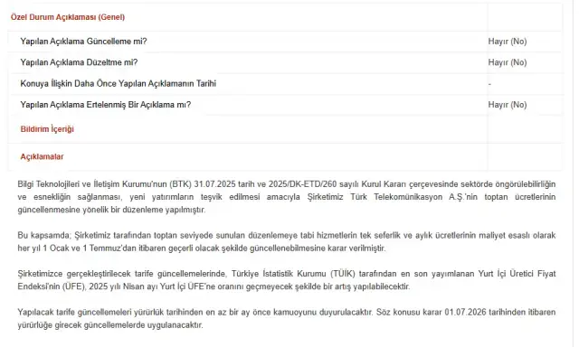 Şirketin KAP açıklamasında şu ifadeler yer aldı; "Bilgi Teknolojileri ve İletişim Kurumu'nun (BTK) 31.07.2025 tarih ve 2025/DK-ETD/260 sayılı Kurul Kararı çerçevesinde sektörde öngörülebilirliğin ve esnekliğin sağlanması, yeni yatırımların teşvik edilmesi amacıyla Şirketimiz Türk Telekomünikasyon A.Ş.'nin toptan ücretlerinin güncellenmesine yönelik bir düzenleme yapılmıştır.