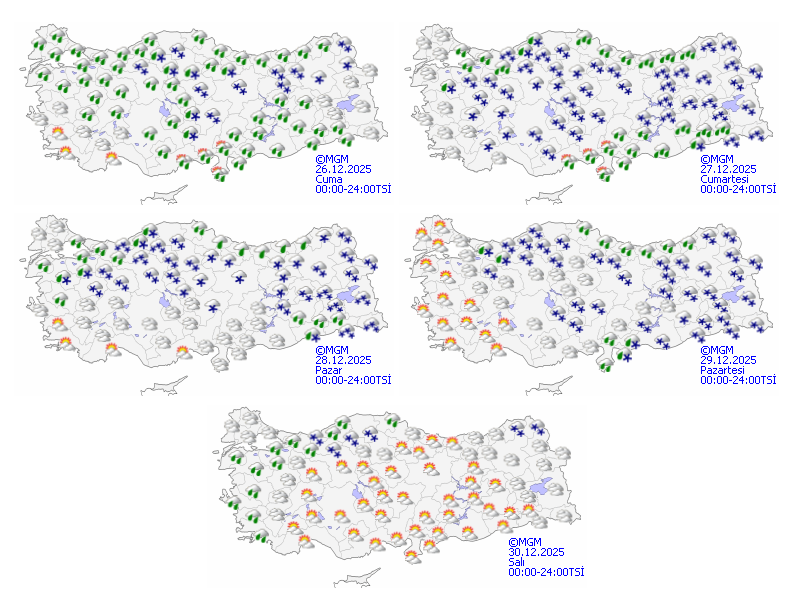 Meteorolojiden tarafından yapılan tahminlere göre: Ülke genelinde havanın parçalı ve çok bulutlu olması beklenirken Marmara'nın doğusu, İç Ege (Denizli hariç), Doğu Akdeniz (Mersin hariç), İç Anadolu, Karadeniz ile Doğu ve Güneydoğu Anadolu'nun yağışlı geçeceği tahmin ediliyor. Genellikle yağmur ve sağanak, akşam saatlerinden sonra İç Ege, Karadeniz'in iç kesimleri, İç Anadolu ve Doğu Anadolu'da karla karışık yağmur ve kar şeklinde görülecek olan yağışların; gece saatlerinden itibaren Zonguldak, Bartın ve Düzce çevrelerinde yerel kuvvetli olması bekleniyor. Hava sıcaklığının mevsim normalleri civarında seyreden hava sıcaklıklarının, kuzey, iç ve doğu kesimler başta olmak üzere yurt genelinde hissedilir derecede (4 ila 10 derece) azalacağı tahmin edilirken rüzgârın genellikle kuzey ve doğulu, yurdun güneydoğu kesimlerinde güneybatı yönlerden hafif, ara sıra orta kuvvette esmesi bekleniyor.