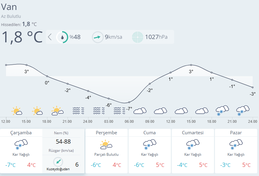 Meteoroloji Van’ın yeni hava durumu raporunu açıkladı. Yapılan son hava tahminlerine göre; Van’da haftalardır kentte etkili olan bahar havası geçtiğimiz hafta sonu itibarıyla 2 günlük kar yağışının etkili altına girmişti. Yeni hafta ile birlikte hava sıcaklığı kent genelinde 3-4 derece artarken gece saatlerinde hava sıcaklığı sıfırın altında 10 derecelere kadar düştü. Van merkezde bugün parçalı bulutlu hava 4°C civarında hissedilirken, yarından itibaren soğuk hava iyice kendini hissettirecek. Önümüzdeki 5 gün boyunca Perşembe hariç yoğun kar yağışının etkisi altına girecek. Kent yarın (04 Mart) gece saatleri itibarıyla 4 günlük kar yağışına bırakacak.
