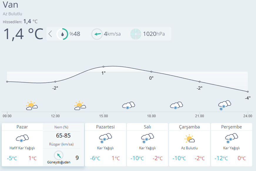 Türkiye’de soğuk ve karlı hava etkisini sürdürmeye devam ediyor. Van’da geçtiğimiz haftalarda etkili olan yoğun kar yağışı bu akşam saatleri itibarıyla kente yeniden giriş yapması bekleniyor. Kar yağışının önümüzdeki Çarşamba günü hariç 4 gün boyunca aralıklarla etkili olması bekleniyor.