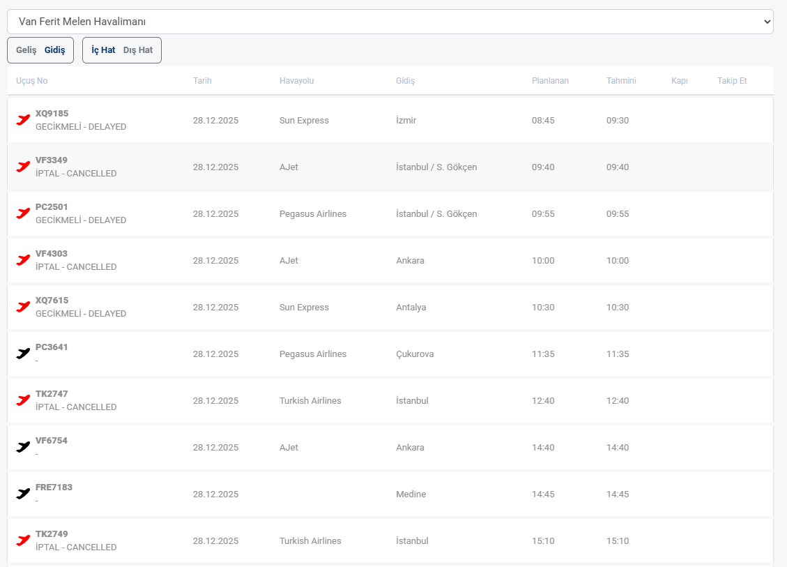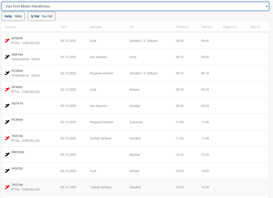 Van’da akşam saatlerinde başlayan ve gece boyunca etkisini artıran kar yağışı, hava ulaşımını olumsuz etkiledi. Olumsuz hava koşulları nedeniyle Van Ferit Melen Havalimanı’nda çok sayıda uçak seferi iptal edildi, bazı seferlerde ise gecikmeler yaşandı.