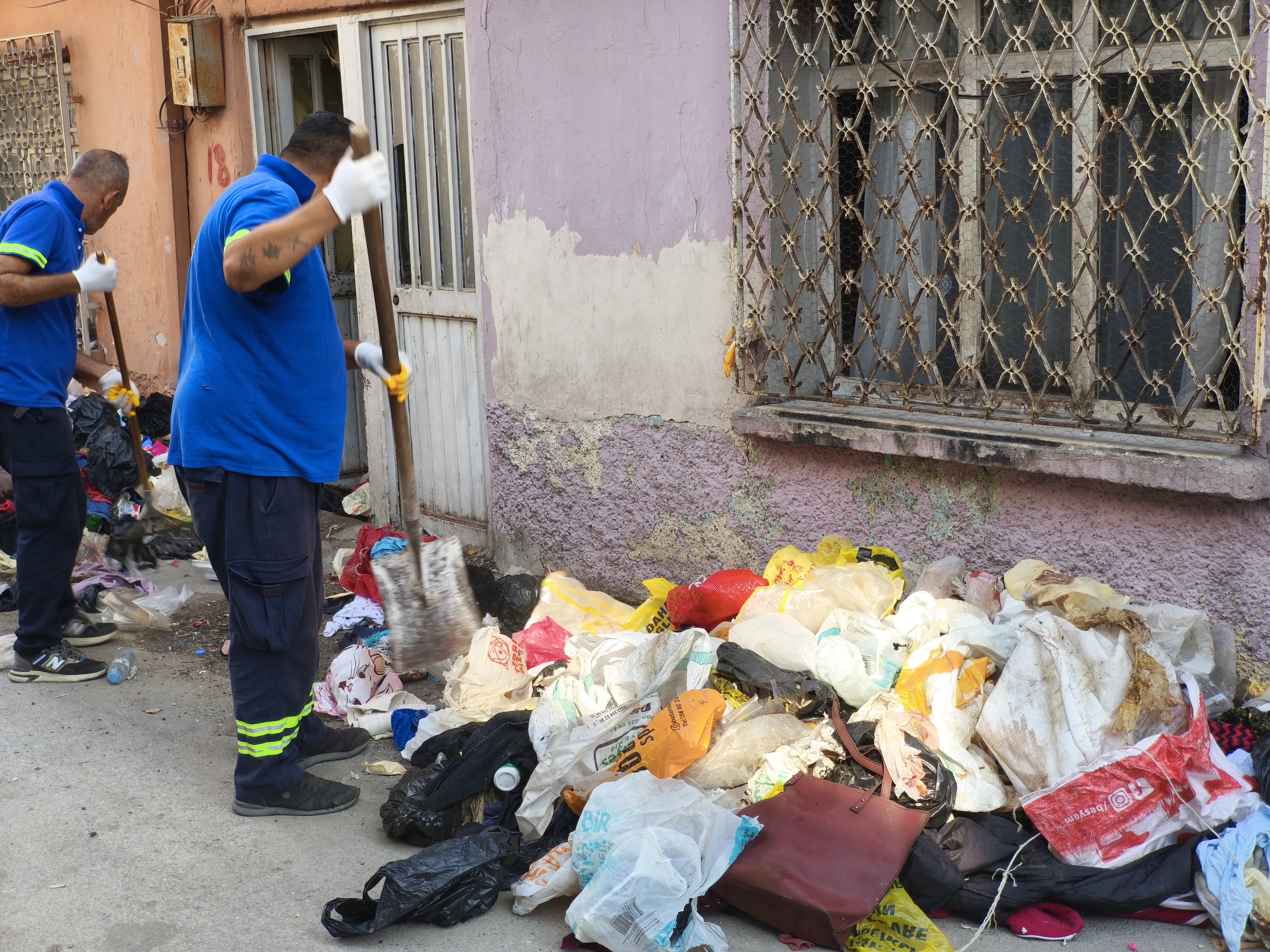 Belediyenin temizlik işçilerinin sokağa yığdığı çöpler, kamyonetlere yüklenip, götürüldü.