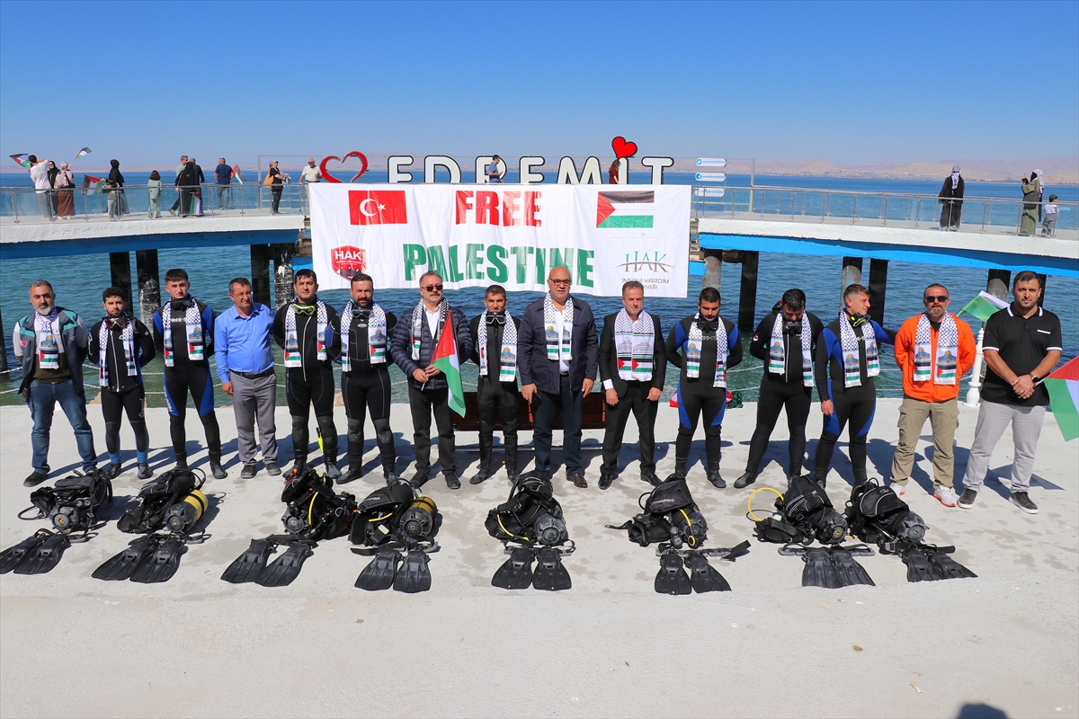 Programda dernek bünyesindeki su altı arama kurtarma dalgıçları da Van Gölü'nde Türk ve Filistin bayrakları açarak İsrail'in saldırılarını protesto etti.
