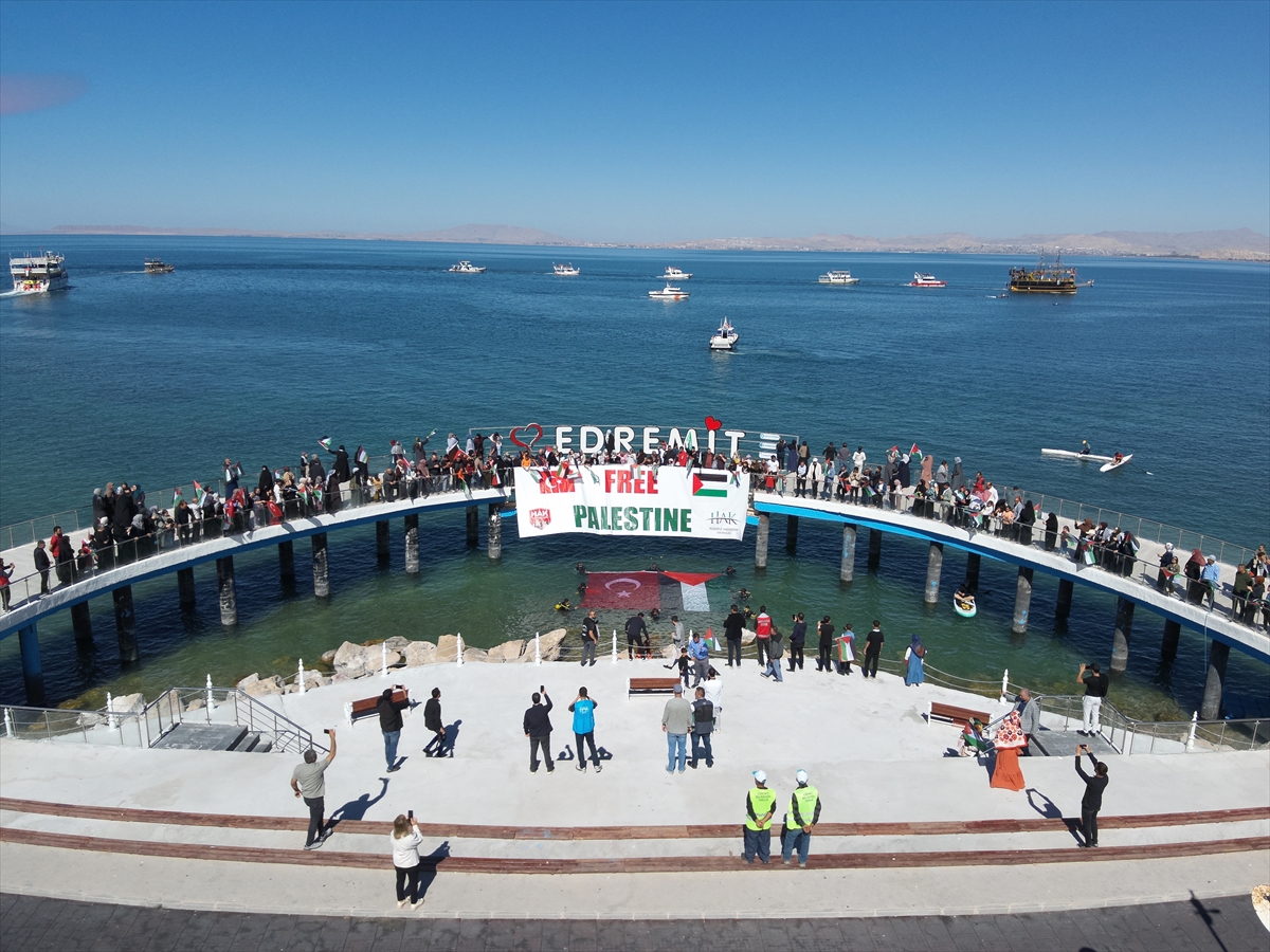 HAK İnsani Yardım Derneği öncülüğünde, birçok kurum ve sivil toplum kuruluşunun desteğiyle Edremit ilçesinde Van Gölü kıyısındaki Kent Meydanı'nda bir araya gelen vatandaşlar, İsrail aleyhine slogan attı.