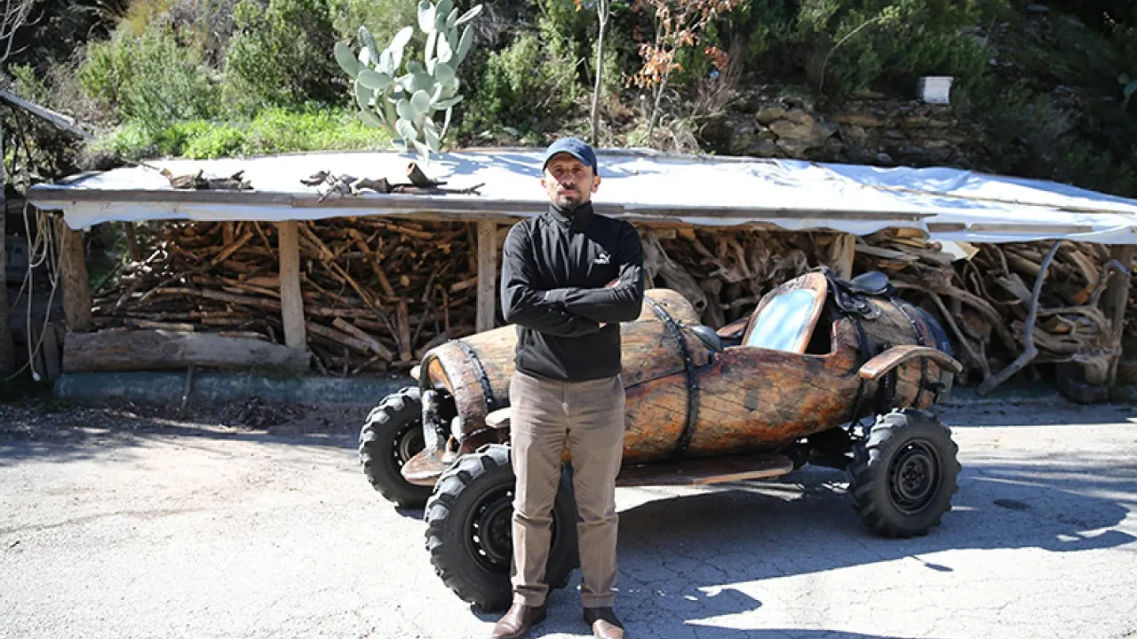 Antalya’nın Alanya ilçesinde marangozluk yapan Adem Say, doğaya ve ahşap sanatına duyduğu tutkuyu benzersiz bir projeyle taçlandırdı. Aile işletmesi olarak işlettiği yayla yolundaki restoranın bahçesinde, odun parçalarını sanat eserlerine dönüştürdüğü küçük bir atölye kurdu. Burada masa, sandalye, askılık, tepsi ve motosiklet gibi el işi ürünler yapan Say, en büyük hayali olan ahşaptan araba üretmeyi ise doğada rastladığı dev bir kütüğü işleyerek gerçekleştirdi.