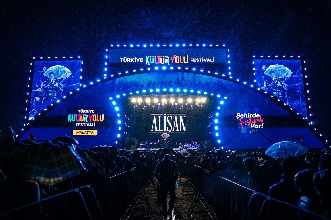 Kültür Yolu Festivali’nin son gününde Malatya 100. Yıl Kent Parkı’nda sahneye çıkan Alişan, kuvvetli yağışa rağmen alanı dolduran binlerce hayranıyla buluştu. Mikrofonun ıslanmaması için şemsiye ile konserini sürdüren ünlü şarkıcı, "Fark Atıyor", "Olay Bitmiştir", "Var Ya" gibi sevilen parçalarının yanı sıra Malatya yöresine ait türkülerle de izleyenlere keyifli anlar yaşattı.