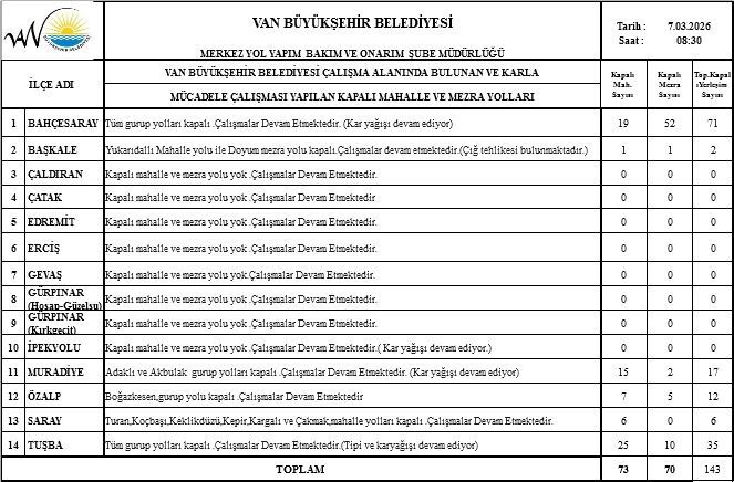 Van’da dün gece saatlerinde etkili olan yoğun kar yağışı ulaşımda da aksamalara neden oldu. Van’da yoğun kar yağışının ardından 73 mahalle ve 70 mezra olmak üzere toplam 143 yerleşim yerinin yolu ulaşıma kapandı. Kent merkezi ve kırsal mahallelerde kar temizleme çalışmalarını sürdüren ekipler kar nedeniyle yolu kapanan yolları açma çalışmalarına da devam ediyor.