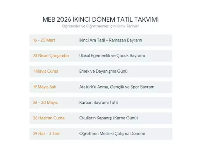Eğitim yılının sonuna yaklaşırken Kurban Bayramı tatili 26 Mayıs Salı günü arefe ile başlayacak ve 30 Mayıs Cumartesi günü sona erecek. Okullarda dersler 26 Haziran Cuma günü tamamlanacak. Eğitim öğretim yılının ardından öğretmenler için 29 Haziran–3 Temmuz tarihleri arasında mesleki çalışma programı uygulanacak. Açıklanan takvimle birlikte ikinci döneme ilişkin tüm tatil ve çalışma günleri netleşmiş oldu.