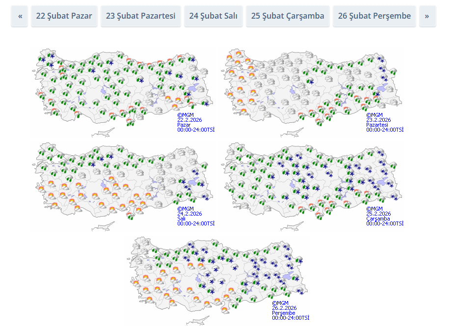 Meteoroloji’nin 22-26 Şubat tarihlerini kapsayan tahmin haritasına göre Doğu Anadolu Bölgesi’nde yeni bir yağışlı hava dalgası etkili olacak. Van’da hafta sonu ve haftanın ilk günü bulutlu bir gökyüzü beklenirken, salı günü itibarıyla yağışlı sistemin kente giriş yapacağı tahmin ediliyor.