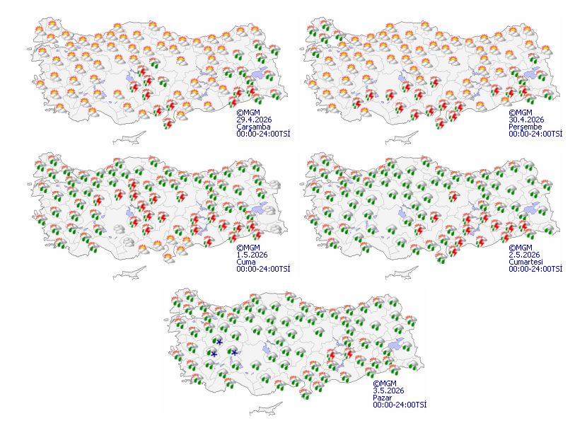 MGM'nin yayımladığı 5 günlük hava tahmin raporuna göre Cuma günü itibariyle Türkiye'nin tamamında yağışlar etkisini gösterecek. Soğuk hava 1 Mayıs Cuma Marmara ve Ege bölgelerinden ülkeye girecek. Hafta sonuysa düşüş tüm bölgelerde hissedilecek. Sıcaklıkların mevsim normallerinin altına inmesi bekleniyor.