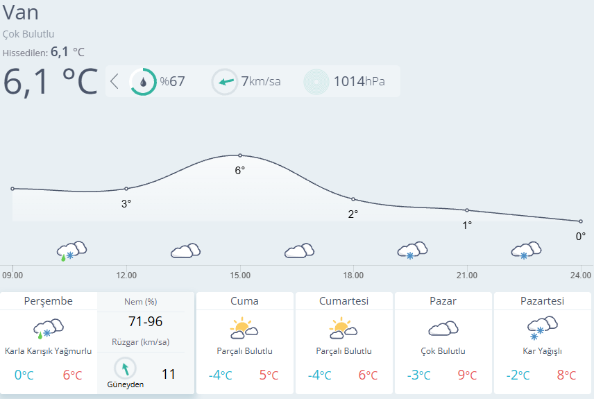 Meteoroloji Van’ın yeni hava durumu raporunu yayımladı. Meteorolojiden yapılan son hava tahminlerine göre; Van’da havanın bugün parçalı ve çok bulutlu, akşam saatlerinden sonra karla karışık yağmur ve kar yağışlı olması bekleniyor. Kar yağışının gece saatlerine kadar aralıklarla karla karışık yağmurlu olması bekleniyor. Van’da yarın (Cuma) havanın parçalı ve az bulutlu olması bekleniyor. Hafta sonunu yağışsız geçirecek olan Van, yeni hafta ile birlikte yeniden kar yağışının etkisi altına girecek. Kar yağışının Çarşamba gününe kadar aralıklarla etkisini sürdürmesi bekleniyor.