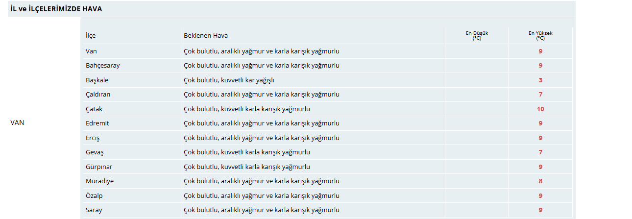 Meteoroloji verilerine göre bölge genelinde havanın çok bulutlu, aralıklı karla karışık yağmurlu; yüksek kesimlerde ise kar yağışlı olması bekleniyor. Yağışların özellikle Van’ın güney ilçeleri ile Hakkari’de zaman zaman kuvvetli olacağı tahmin ediliyor.