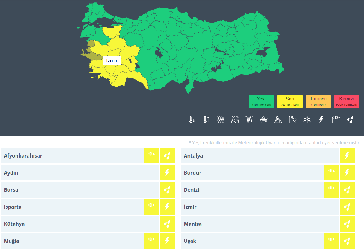 Meteoroloji tarafından "sarı" alarm verilerek şiddetli sağanak uyarısında bulunulan illerimiz şöyle: Afyonkarahisar, Antalya, Aydın, Burdur, Bursa, Denizli, Isparta, İzmir, Kütahya, Manisa, Muğla, Uşak.
