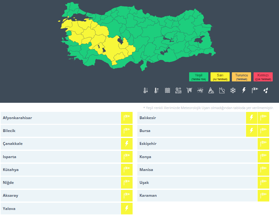 Yağışların, Marmara'nın güney ve doğusu ile Düzce, Zonguldak ve Bartın çevrelerinde yer yer kuvvetli olması beklendiğinden yaşanabilecek olumsuzluklara karşı dikkatli ve tedbirli olunmalıdır.