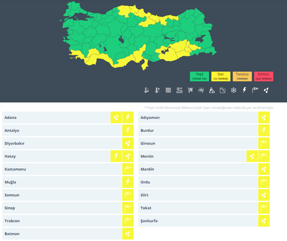 Yağışların Kıyı Ege, Batı Akdeniz kıyıları, Doğu Akdeniz ile Adıyaman, Gaziantep ve Kilis çevrelerinde yer yer kuvvetli olması beklendiğinden yaşanabilecek olumsuzluklara karşı dikkatli ve tedbirli olunması için uyarı yapıldı.