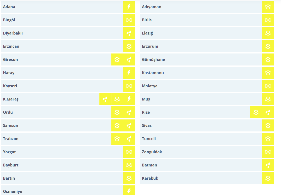 Adana, Osmaniye, Hatay ve Kahramanmaraş’ta kuvvetli, Hatay'ın batı ilçelerinde yer yer çok kuvvetli sağanak ve gök gürültülü sağanak yağış yükseklerinde kuvvetli karla karışık yağmur ve kar, Zonguldak, Bartın ve Karabük illerinin yüksekleri, Düzce’nin doğusunun yüksekleri, Bolu’nun kuzeyi ve Kastamonu’nun kuzeyinin yükseklerinde yer yer kuvvetli kar, Samsun’un doğusu, Ordu, Giresun, Trabzon, Rize ve Artvin'de kuvvetli sağanak yağış, İç Anadolu'nun doğusu, Orta ve Doğu Karadeniz'in yüksekleri, Doğu Anadolu'nun batısı ve Adıyaman'ın kuzey kesimlerinde kuvvetli kar yağışları beklendiğinden ulaşımda aksamalar, heyelan, yüksek kesimlerde buzlanma ve don, çığ riski, sel ve su baskınına karşı dikkatli ve tedbirli olunmalıdır.