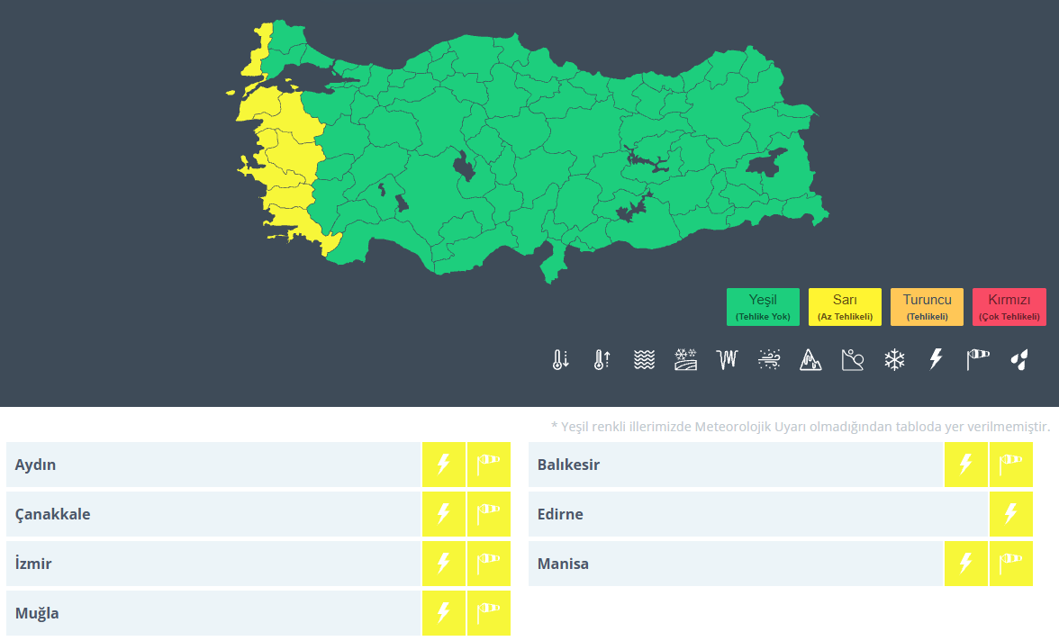 Meteoroloji kuvvetli sağanak ve fırtına nedeniyle 7 ilde sarı kodlu uyarı verdi. O iller; Aydın, Balıkesir, Çanakkale, Edirne, İzmir, Manisa ve Muğla.