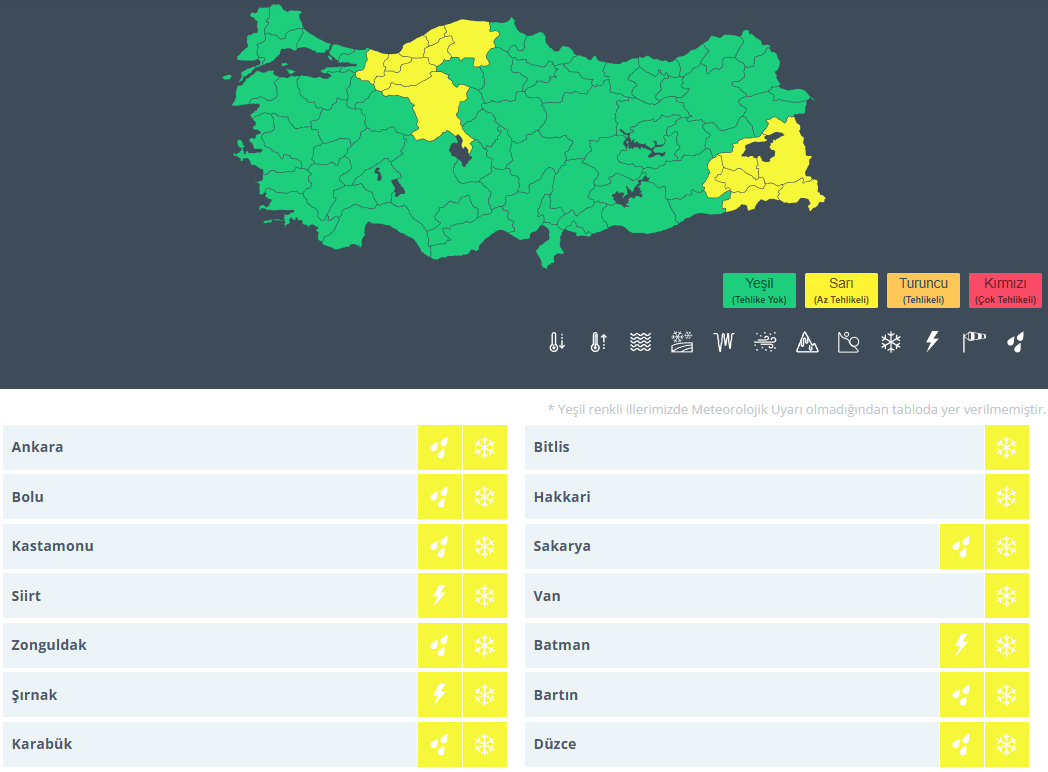 Yağışların, Marmara’nın doğusu, Doğu Akdeniz, Batı Karadeniz’in batısı, Doğu Anadolu’nun güneydoğusu ile Siirt, Batman, Rize, Artvin ve Ardahan çevrelerinde kuvvetli olması beklendiğinden yaşanabilecek olumsuzluklara karşı dikkatli ve tedbirli olunmalıdır.