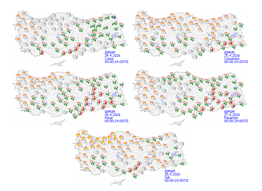 Meteorolojiden yapılan son değerlendirmelere göre: Ülke genelinde havanın parçalı ve çok bulutlu olması beklenirken Akdeniz (Hatay hariç), İç Anadolu’nun güney ve doğusu, Doğu Karadeniz, Doğu Anadolu ile, Denizli, Afyonkarahisar, Ordu, Tokat, Siirt ve Adıyaman çevrelerinin aralıklı yağmur ve sağanak, yer yer gök gürültülü sağanak yağışlı, Doğu Karadeniz’in iç kesimlerinin yüksekleri ile Doğu Anadolu’nun kuzeydoğusunun yükseklerinin karla karışık yağmur ve yer yer kar yağışlı geçeceği tahmin ediliyor.