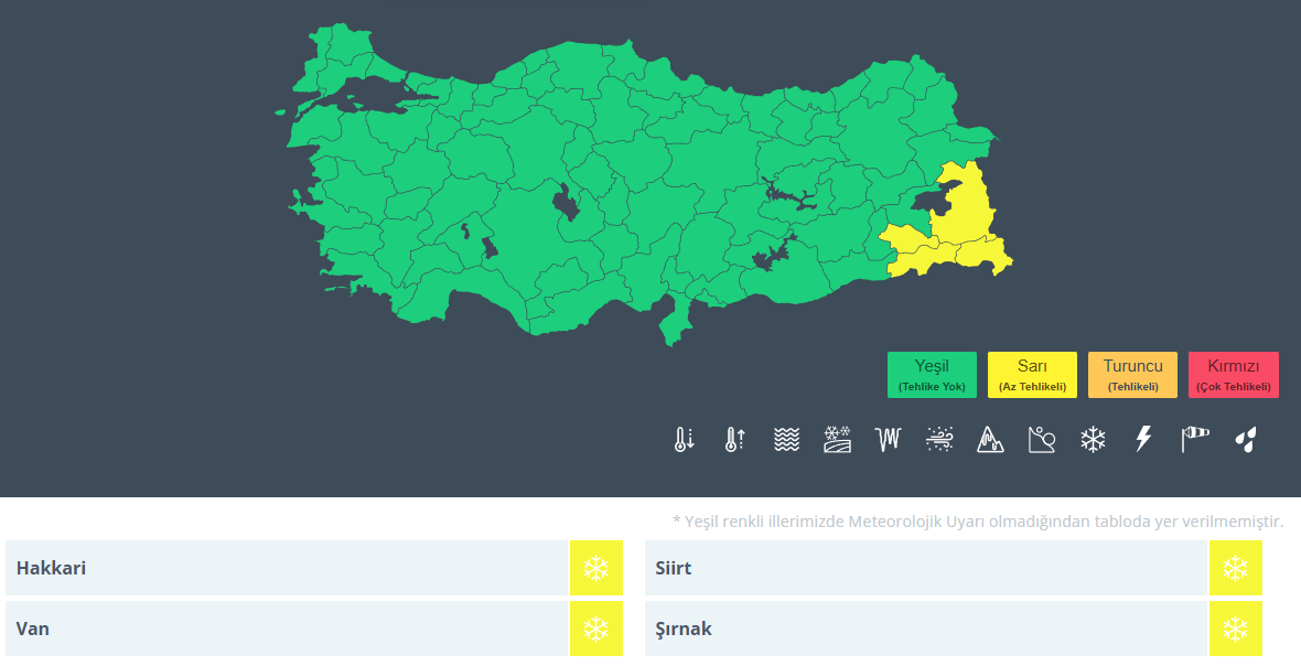 Yağışların, Doğu Karadeniz kıyıları, Ordu ve Mersin çevreleri ile Adana'nın batısı, Hakkari, Şırnak’ın doğusu, Siirt-Pervari ilçesi ile Van’ın güneyinde yer yer kuvvetli olması beklendiğinden yaşanabilecek olumsuzluklara karşı dikkatli ve tedbirli olunması gerekmektedir.