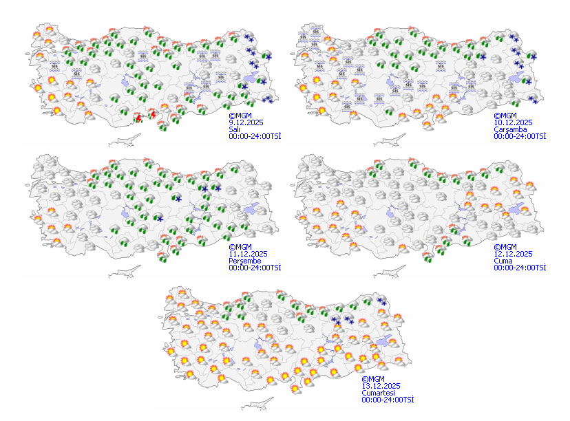 Meteorolojiden yapılan son hava tahminlerine göre: Ülke genelinde havanın parçalı ve çok bulutlu olması bekleniyor. Marmara'nın doğusu, Doğu Akdeniz, İç Anadolu'nun güney ve doğusu, Batı Karadeniz, Orta ve Doğu Karadeniz kıyıları, Doğu Anadolu'nun doğusu, Güneydoğu Anadolu ile Amasya, Tokat ve Gümüşhane çevrelerinin yağışlı geçmesi, Mersin kıyılarının sağanak ve gök gürültülü sağanak yağış bekleniyor. Doğu Anadolu’nun doğusu ile Orta Akdeniz’in iç kesimlerinin yükseklerinin karla karışık yağmur ve kar yağışlı, diğer yerlerinde sağanak ve yağmurlu geçmesi tahmin ediliyor. Yağışların, Doğu Karadeniz kıyıları, Ordu ve Mersin çevreleri ile Adana'nın batısı, Hakkari, Şırnak’ın doğusu, Siirt-Pervari ilçesi ile Van’ın güney ilçelerinde (Başkale, Bahçesaray, Çatak, Gürpınar) kuvvetli olması bekleniyor. Rüzgarın; Marmara’nın batısı ve Kıyı Ege’de kuzeyli yönlerden kuvvetli olarak (40-60 km/saat) esmesi bekleniyor. Sabah ve gece saatlerinde iç bölgelerde pus ve yer yer sis bekleniyor. Hava sıcaklığının İç Anadolu ve Doğu Karadeniz kıyılarında 3 ila 5 derece azalacağı diğer yerlerde önemli bir değişiklik beklenmezken rüzgarın genellikle kuzeyli yönlerden hafif, ara sıra orta kuvvette, Marmara'nın batısı ile Ege kıyılarında kuvvetli (40-60 km/saat) eseceği tahmin ediliyor.