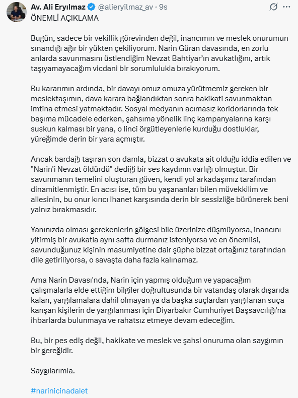 Eryılmaz sosyal medyada yaptığı paylaşımında, Bahtiyar’ın avukatlığından çekildiğini duyurarak, “Bugün, sadece bir vekillik görevinden değil, inancımın ve meslek onurumun sınandığı ağır bir yükten çekiliyorum. Narin Güran davasında, en zorlu anlarda savunmasını üstlendiğim Nevzat Bahtiyar’ın avukatlığını, artık taşıyamayacağım vicdani bir sorumlulukla bırakıyorum. Bu kararımın ardında, bir davayı omuz omuza yürütmemiz gereken bir meslektaşımın, dava karara bağlandıktan sonra hakikati savunmaktan imtina etmesi yatmaktadır. Sosyal medyanın acımasız koridorlarında tek başıma mücadele ederken, şahsıma yönelik linç kampanyalarına karşı suskun kalması bir yana, o linci örgütleyenlerle kurduğu dostluklar, yüreğimde derin bir yara açmıştır.” ifadelerini kullandı.