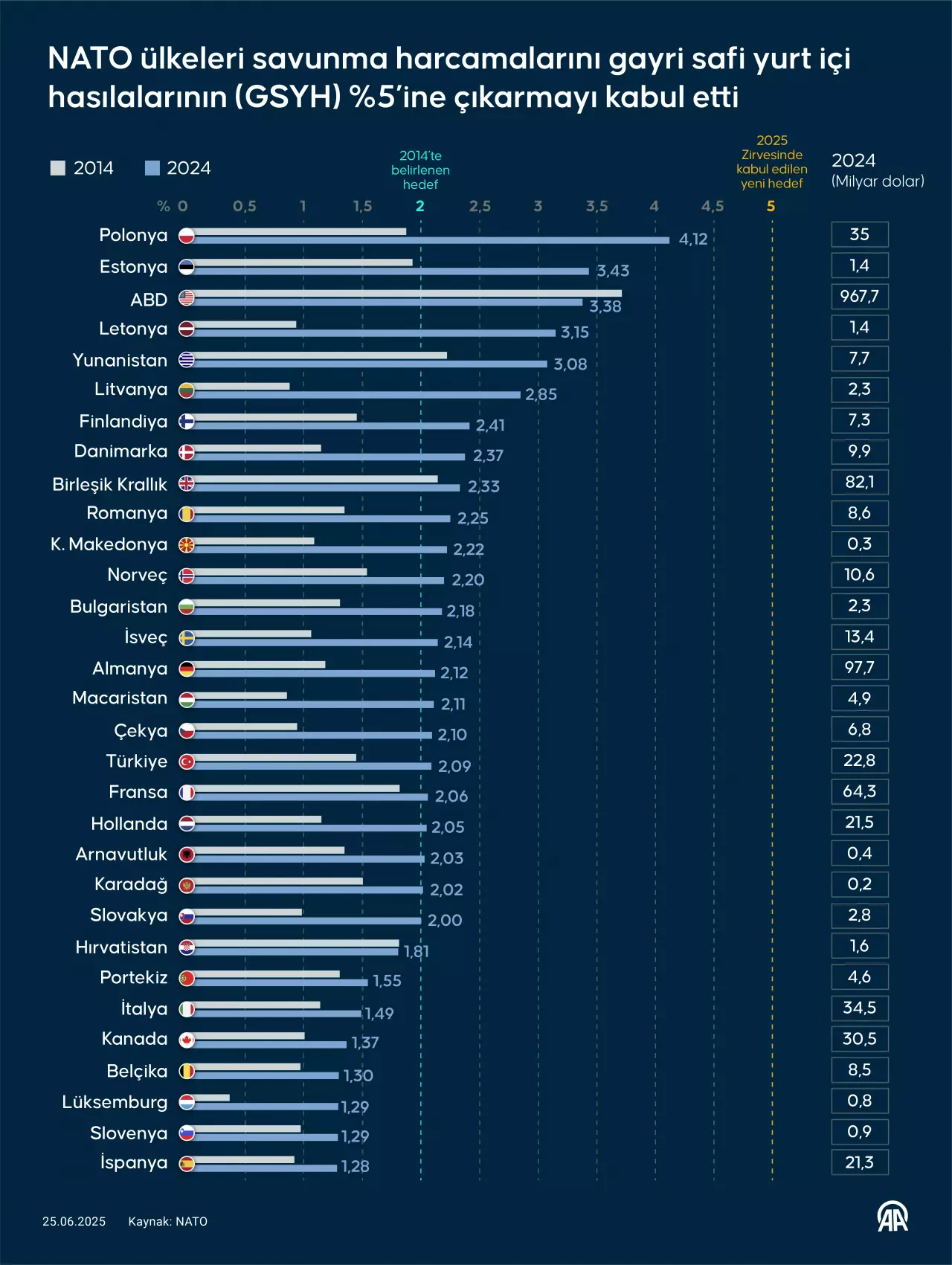 NATO Liderler zirvesinin sonuç bildirisi yayınlandı. Buna göre müttefikler savunma harcamalarına ayırdıkları payı 2035 yılına kadar gayri safi yurt içi hasılalarının yüzde 5’ine çıkarmayı da kabul etti.