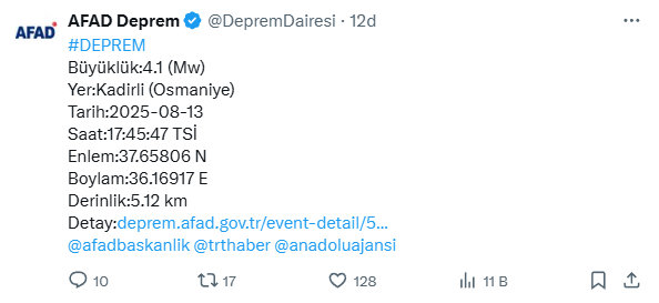 AFAD, Osmaniye’nin Kadirli ilçesinde, saat 17.45’te 4.1 büyüklüğünde deprem meydana geldiğini duyurdu. Yaşanan sarsıntı yerin 5.12 km derinliğinde gerçekleştiği kaydedildi.