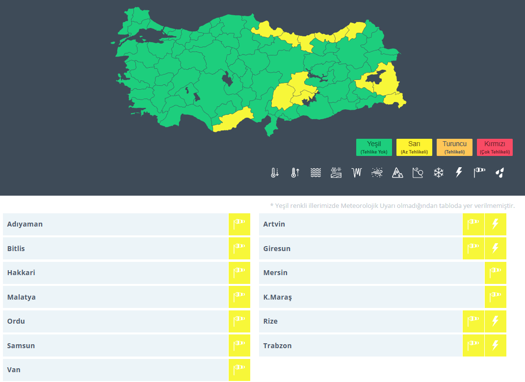 Meteoroloji, Van dahil 13 il için sarı kod uyarısında bulundu. Meteoroloji; Adıyaman, Artvin, Bitlis, Giresun, Hakkari, Mersin, Malatya, Kahramanmaraş, Ordu, Rize, Samsun, Trabzon ve Van için sarı kod uyarısında bulunarak sağanak yağış ve fırtına uyarısı yaptı.