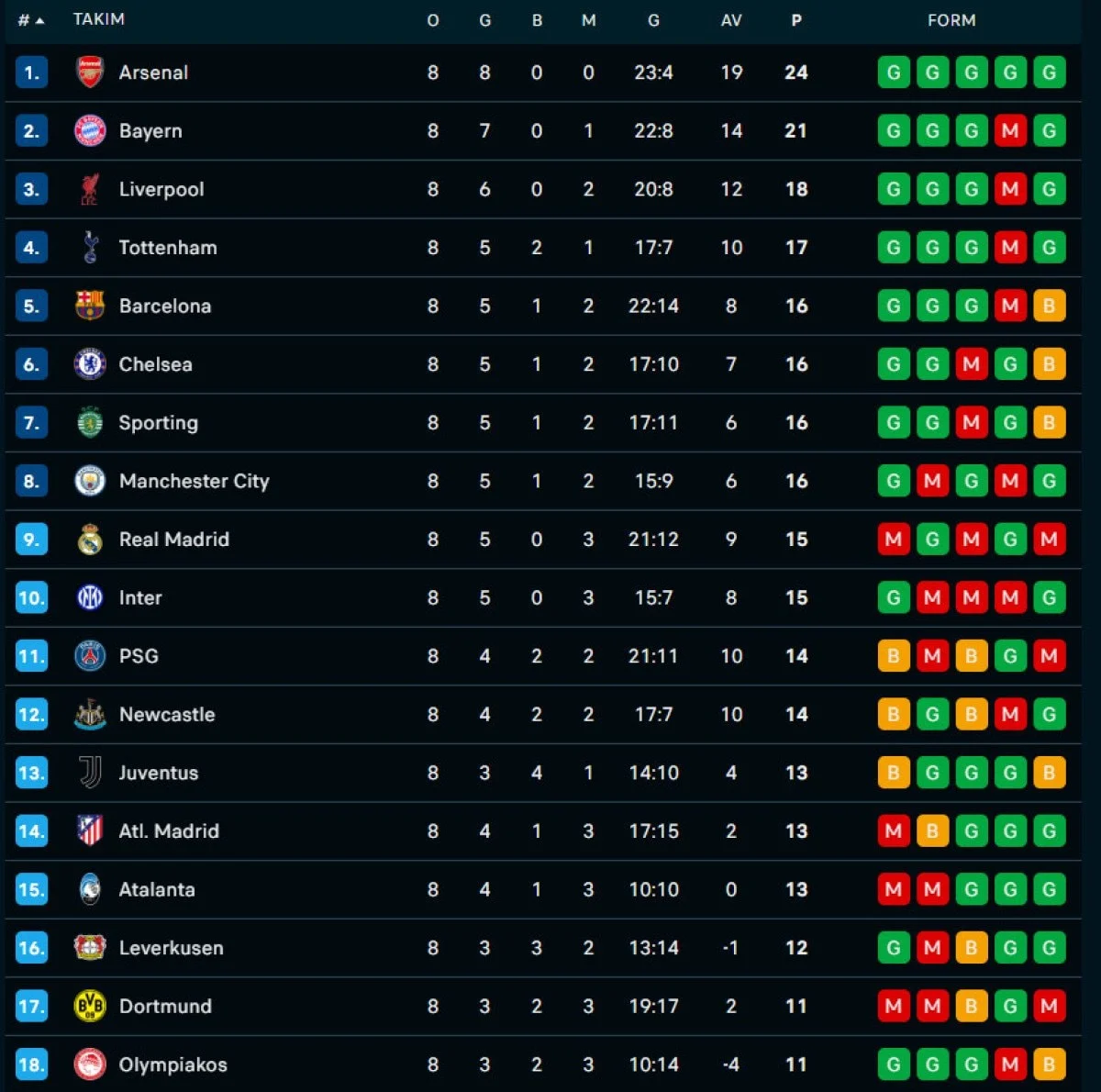Avrupa futbolunun kulüpler düzeyindeki bir numaralı turnuvası olan UEFA Şampiyonlar Ligi'nde lig aşaması dün gece oynanan 8. hafta maçlarının ardından sona erdi. Nefes kesen karşılaşmaların ardında ilk 8’e kalan ve son 24’e kalan takımlar belli oldu.