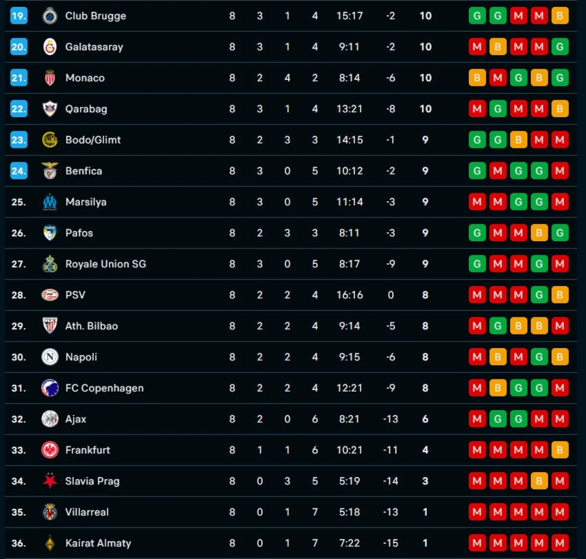 Ligde 25-36. sırada yer alan ekipler, UEFA Şampiyonlar Ligi'ne veda etti. Olimpik Marsilya, Pafos, Union Saint-Gilloise, PSV, Athletic Bilbao, Napoli, Kopenhag, Ajax, Eintracht Frankfurt, Slavia Prag, Villarreal ve Kairat, Avrupa defterini kapattı.