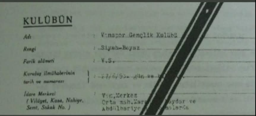 Türkiye'nin en köklü spor kulüplerinden Vanspor'un kuruluşunun tescillendiği tarihi resmi belgede şu bilgiler yer almaktadır.