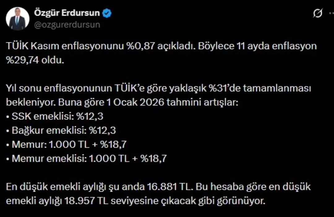 TÜİK Kasım ayı enflasyonunu açıkladı; aylık enflasyon yüzde 0,87, yıllık enflasyon yüzde 31,07 oldu. Buna göre milyonların Ocak 2026 maaş zammı için 5 aylık enflasyon farkı netleşti. Şimdi gözler Ocak ayında açıklanacak Aralık enflasyonuna çevrildi. Ocak maaş zammı için 1 enflasyon verisi kalırken şimdiden maaş hesapları ve tahminler yapılıyor. Ssoyal Güvenlik Uzmanı Özgür Erdursun, sosyal medya hesabından yaptığı paylaşımda "TÜİK Kasım enflasyonunu %0,87 açıkladı. Böylece 11 ayda enflasyon %29,74 oldu" ifadelerini kullandı.