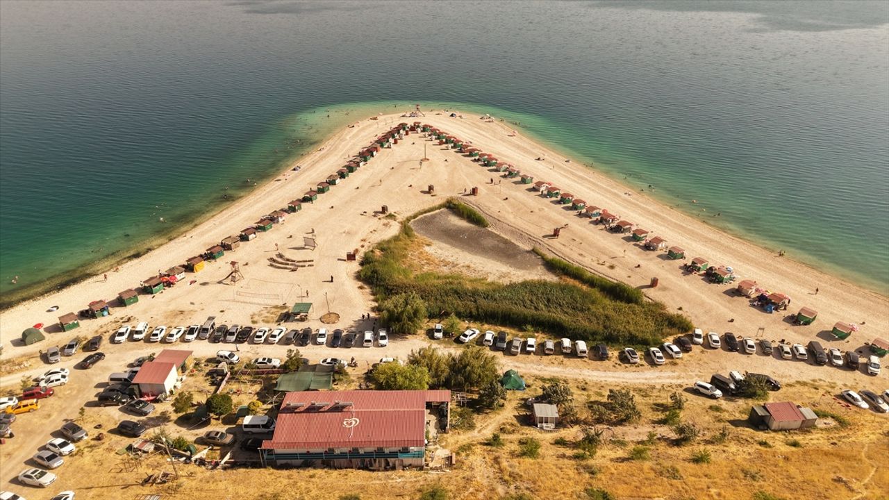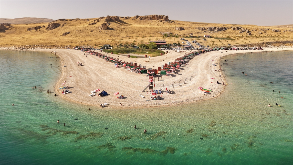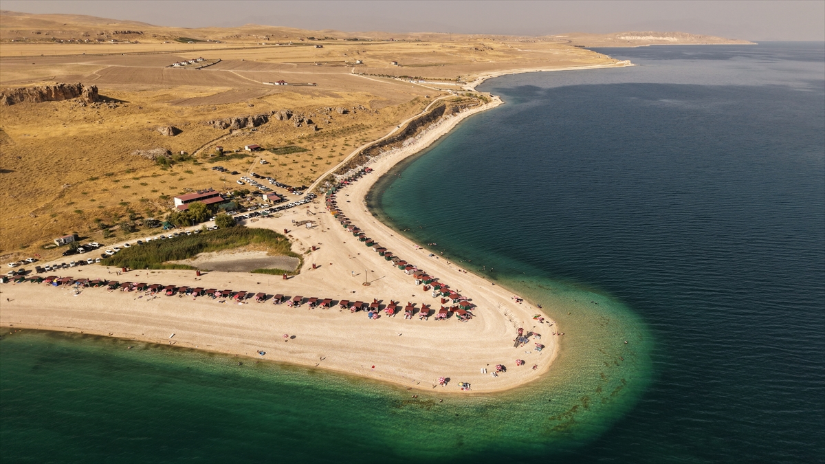 Göle kıyısı bulunan Erciş ilçesine 20 kilometre mesafede bulunan yarım adadaki plaja gelenler, dinlenme ve gölde yüzerek serinleme imkanı buluyor.