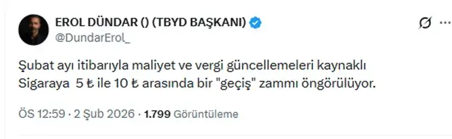 Tekel Bayiler Yardımlaşma Derneği Başkanı Erol Dündar, maliyet artışları ve vergi düzenlemeleri nedeniyle sigara fiyatlarına yönelik yeni bir zammın öngörüldüğünü açıkladı. Başkan Erol Dündar, açıklamasında şu ifadeleri kullandı: "Şubat ayı itibarıyla maliyet ve vergi güncellemeleri kaynaklı sigaraya 5 TL ile 10 TL arasında bir 'geçiş' zammı öngörülüyor."