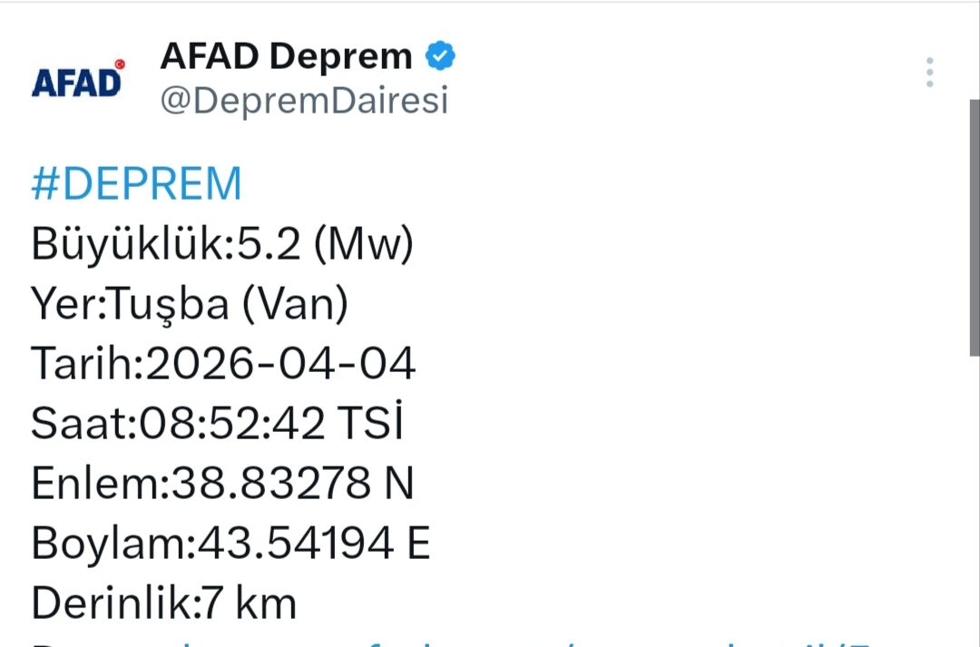 Van ilimizin Tuşba ilçesinde 5.2 büyüklüğünde bir deprem meydana gelmiştir. Ağrı, Hakkari, Iğdır ve Bitlis illerinden de hissedilen depremle ilgili olarak AFAD, Jandarma, Emniyet ve diğer görevli personelimizin saha taramaları devam etmektedir. Şu ana kadar 112 Acil Çağrı Merkezi'ne gelen ihbarların değerlendirilmesi sonucunda herhangi bir can kaybı ve olumsuzluk bulunmamaktadır.