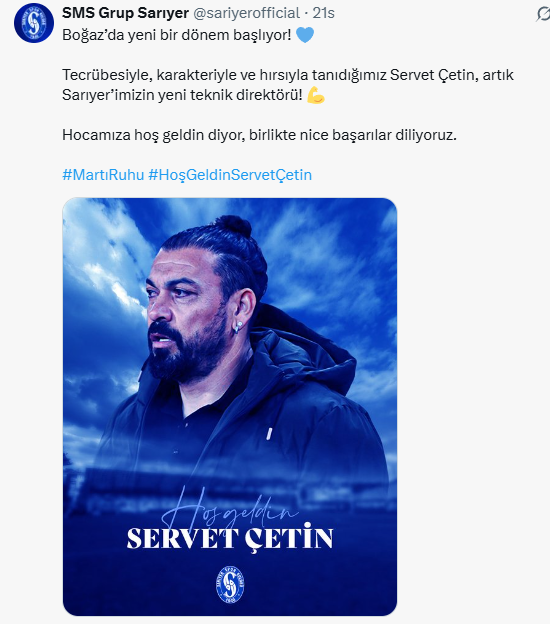 Kulübün X sosyal medya platformundaki hesabından yapılan açıklamada, "Tecrübesiyle, karakteriyle ve hırsıyla tanıdığımız Servet Çetin, artık Sarıyer'imizin yeni teknik direktörü. Hocamıza 'hoş geldin' diyor, birlikte nice başarılar diliyoruz." ifadeleri kullanıldı.