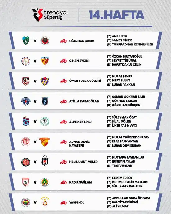 Trendyol Süper Lig’de heyecan kaldığı yerden devam ediyor… Trendyol Süper Lig'de 14. haftanın hakemleri açıklanırken haftanın en önemli maçı olan Fenerbahçe ile Galatasaray derbisini yönetecek hakemler de belli oldu.