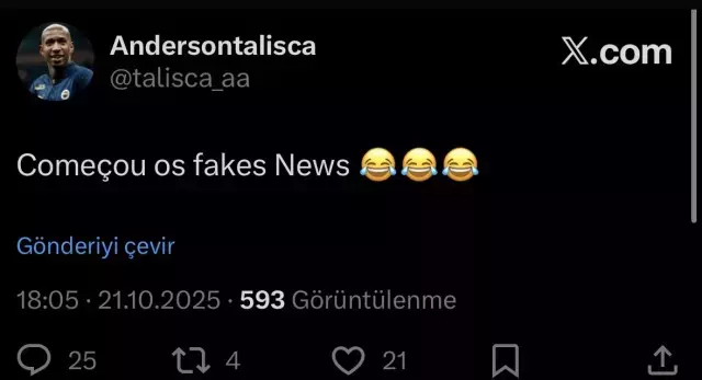 ' Brezilya'ya dönmek istiyor' şeklindeki çıkan haberlere cevap veren Talisca, sosyal medya hesabından "Sahte haberler başladı" paylaşımında bulundu.